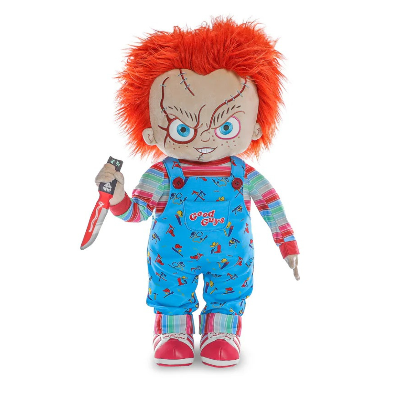 Wanna play? Give your horror collection a killer new addition with this Evil Chucky Life-Size Plush by Kidrobot. With his sinister expression and bloody knife in hand, Chucky might have a different idea of what it means to play. The 2.5-foot plush is wearing his signature Good Guys overalls, striped shirt, and red sneakers complete with Good Guys shoelaces. The life-size plush also stands on its own thanks to weighted feet. With its eerie embroidered facial details and unmistakable red hair, this collectible Chucky doll may have you sleeping with one eye open! Hungry for more horror?