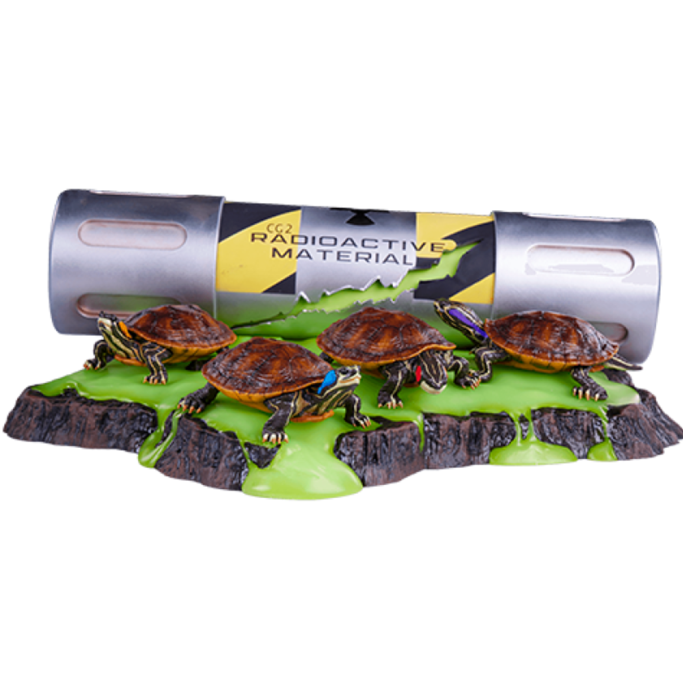 All four beautifully detailed turtles, depicted before their mutations, crawl through the radioactive goo that seeps across the sewer floor from the ruptured canister that anchors the diorama. Each turtle also features a small splash of color on its neck as a nod to the colors they will later adopt in their crime-fighting personas.