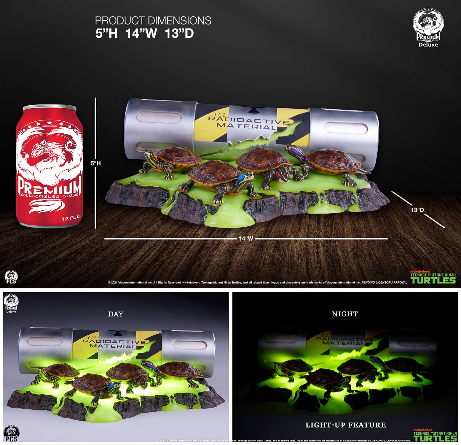 The TMNT: Origins Diorama is a fully sculpted collectible that measures 5"H x 14"W x 13"D recreating the moment young Leonardo, Raphael, Michelangelo and Donatello came in contact with the bright green ooze that would transform them into the Teenage Mutant Ninja Turtles.