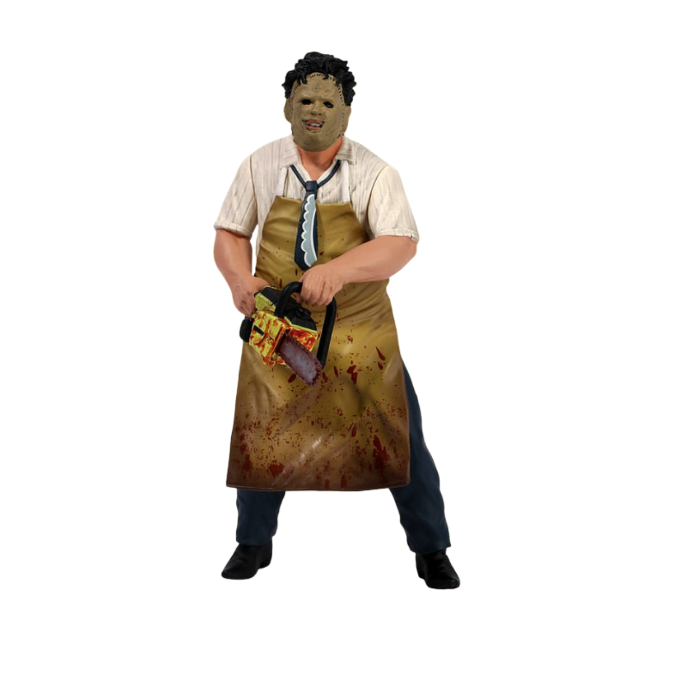 Leatherface is dressed to distress in his classic bloodstained apron, collared shirt, and tie. The masked maniac is armed with his signature chainsaw that he can hold in both hands, revving up for a slaughterhouse showdown!