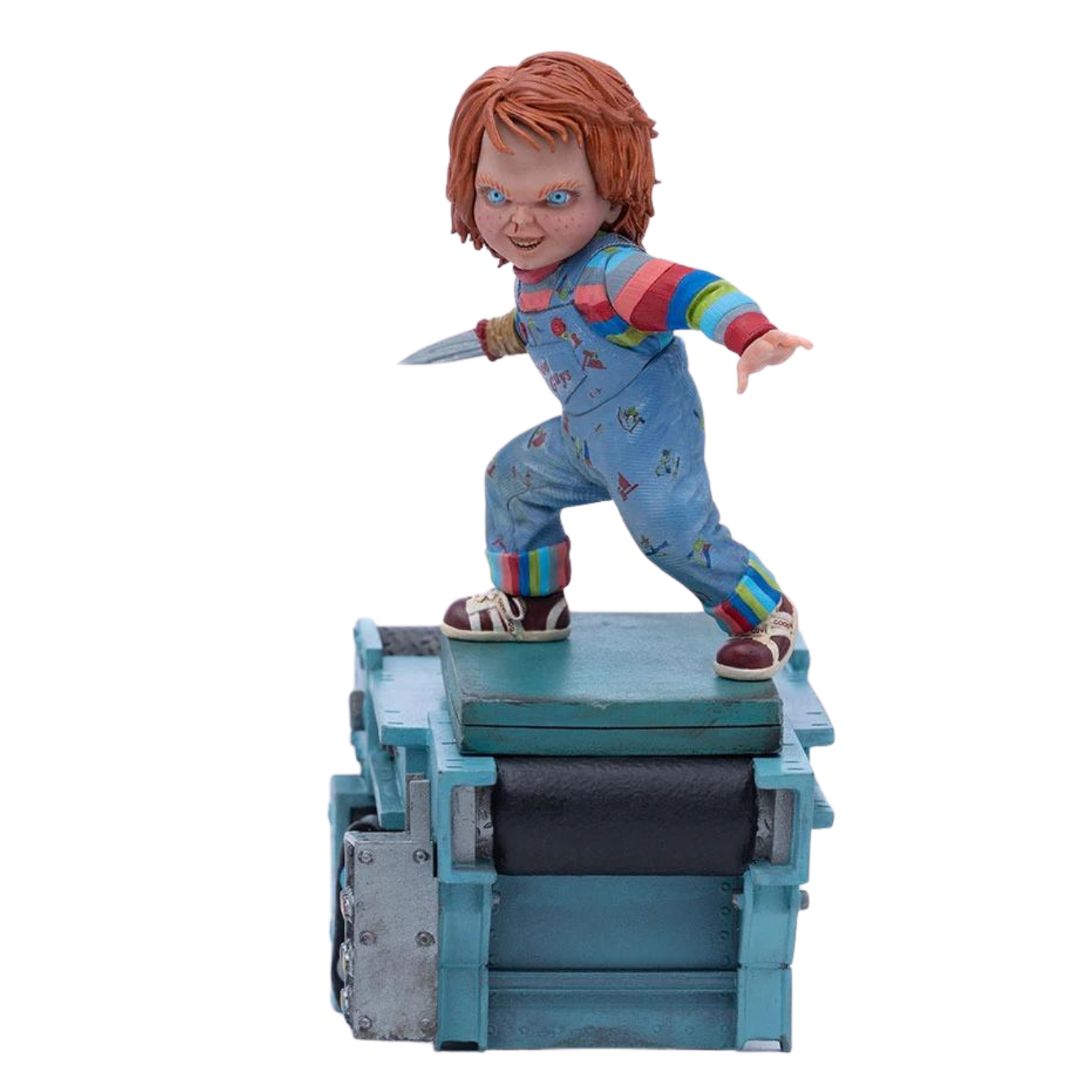 The unmistakable red-haired doll with colorful clothes is standing on the treadmill of one of the machines at the toy factory called Play Pals, where his plastic body was manufactured just like in the second film of his long trajectory in theaters. The doll appears with its lethal knife inserted in one of his fists, a sadistic smile on its face, and its big blue eyes focused on its next victim. The "Child's Play II Chucky - Art Scale 1:10 - Child's Play II - Iron Studios" statue arrives to add another cinema icon to Iron Studios' horror line.