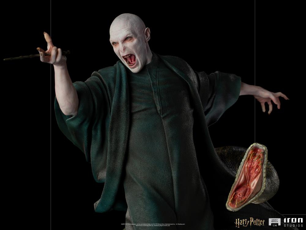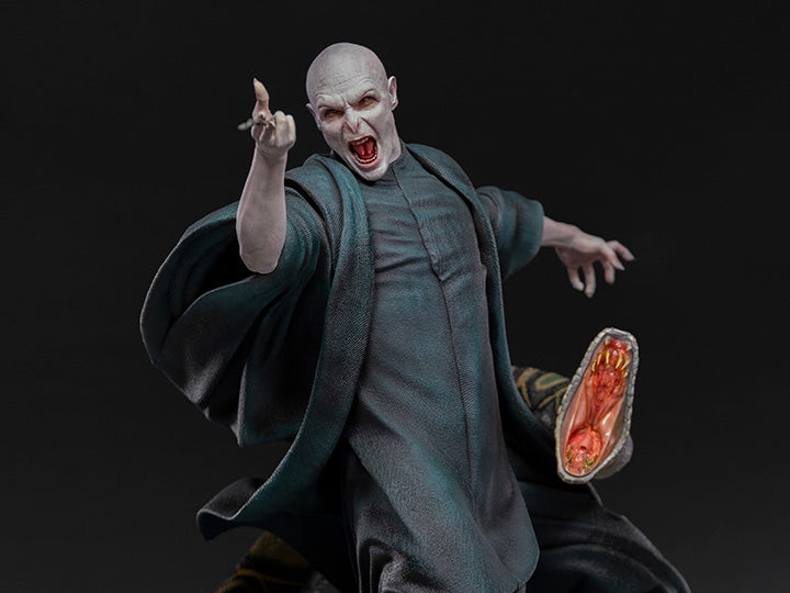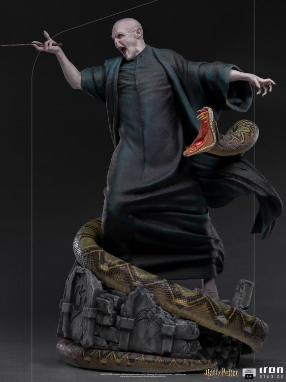Barefoot and climbing a base formed by the remnants of concrete and stones from Hogwarts Castle, Harry Potter's most feared villain, Lord Voldemort, is immortalized in a meticulously detailed statue that captures the actor Ralph Fiennes as seen in the film series. It is the first statue of the Harry Potter franchise to be developed in 1/4 scale by Iron Studios.