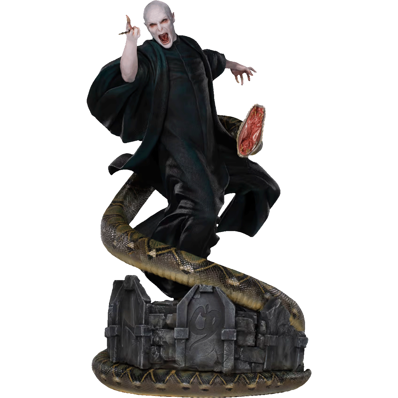 Considered the most powerful dark wizard, Lord Voldemort's monstrous pale face exudes all the intensity of his malice, spite, and fury. He wields his wand in his right hand, poised to unleash one more destructive spell against anyone who opposes his will. His cadaverous slender body is covered by a black toga and is surrounded and protected by Nagini, a huge snake that guards part of his dark soul as a Horcrux.