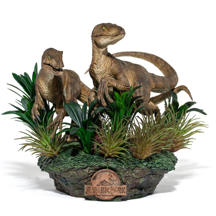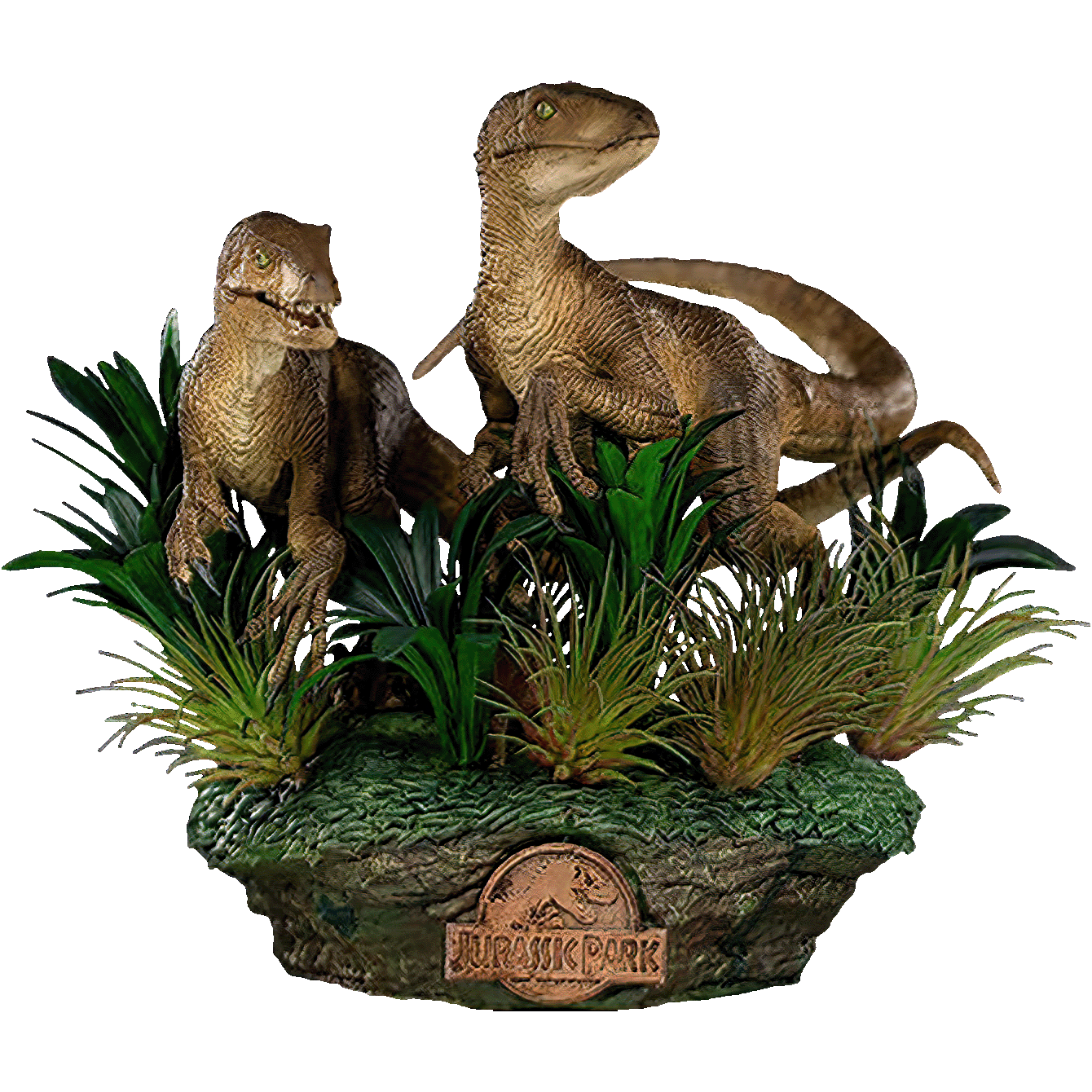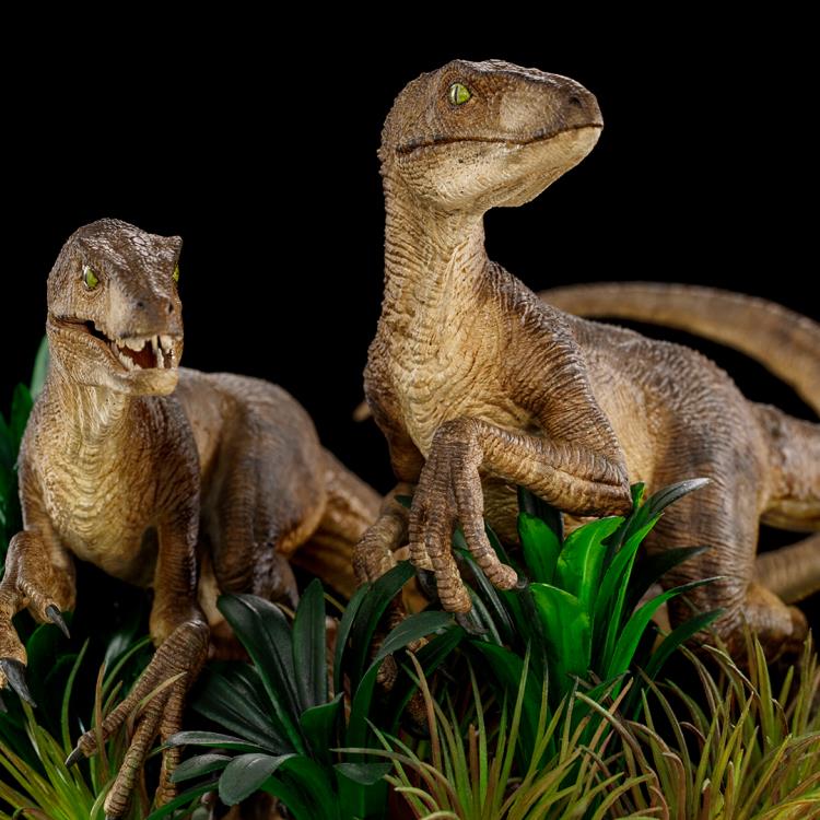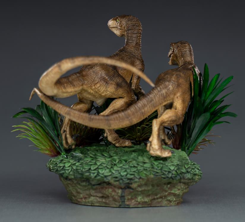 Hidden among bushes, two prehistoric predators sneak forward, watching and sniffing out their next prey. They hunt together using their natural intelligence to reach their goal faster and more effectively. Among the most feared creatures of the Jurassic world recreated by man, Iron Studios presents "Just The Two Raptors," featuring the lethal Velociraptors, to honor the legacy of the work of Stan Winston and Steven Spielberg.