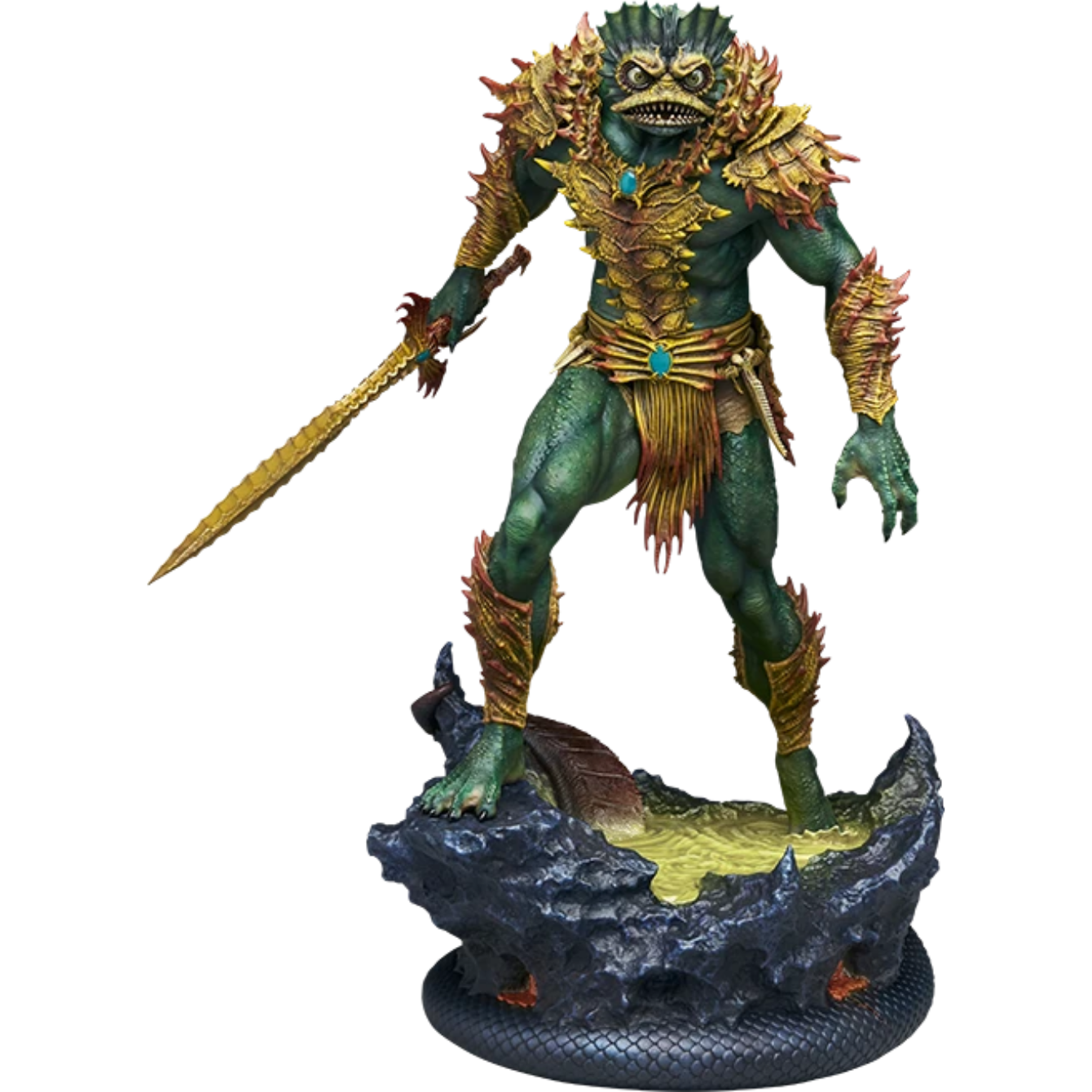 The Mer-Man Maquette measures 17.4” tall and 14.25” wide as the master of Eternia’s oceans rises from a murky Snake Mountain themed base. This MOTU collectible maquette is fully sculpted and vibrantly painted in a way that celebrates his original two-dimensional appearance with an in-depth three-dimensional update. Mer-Man’s yellow and orange armor features shell and coral-like shapes and textures, giving him a formidable spined silhouette.