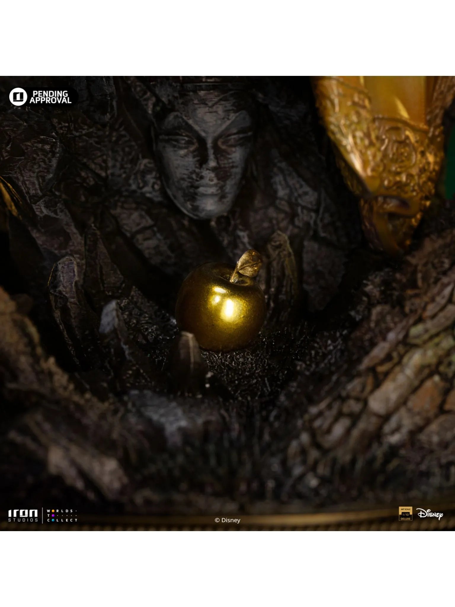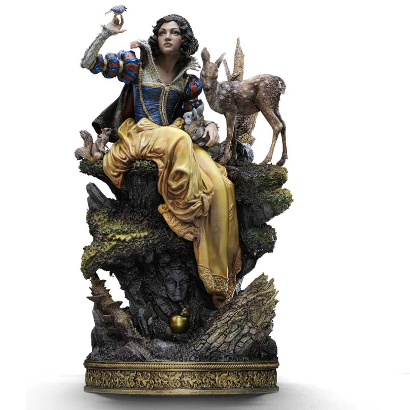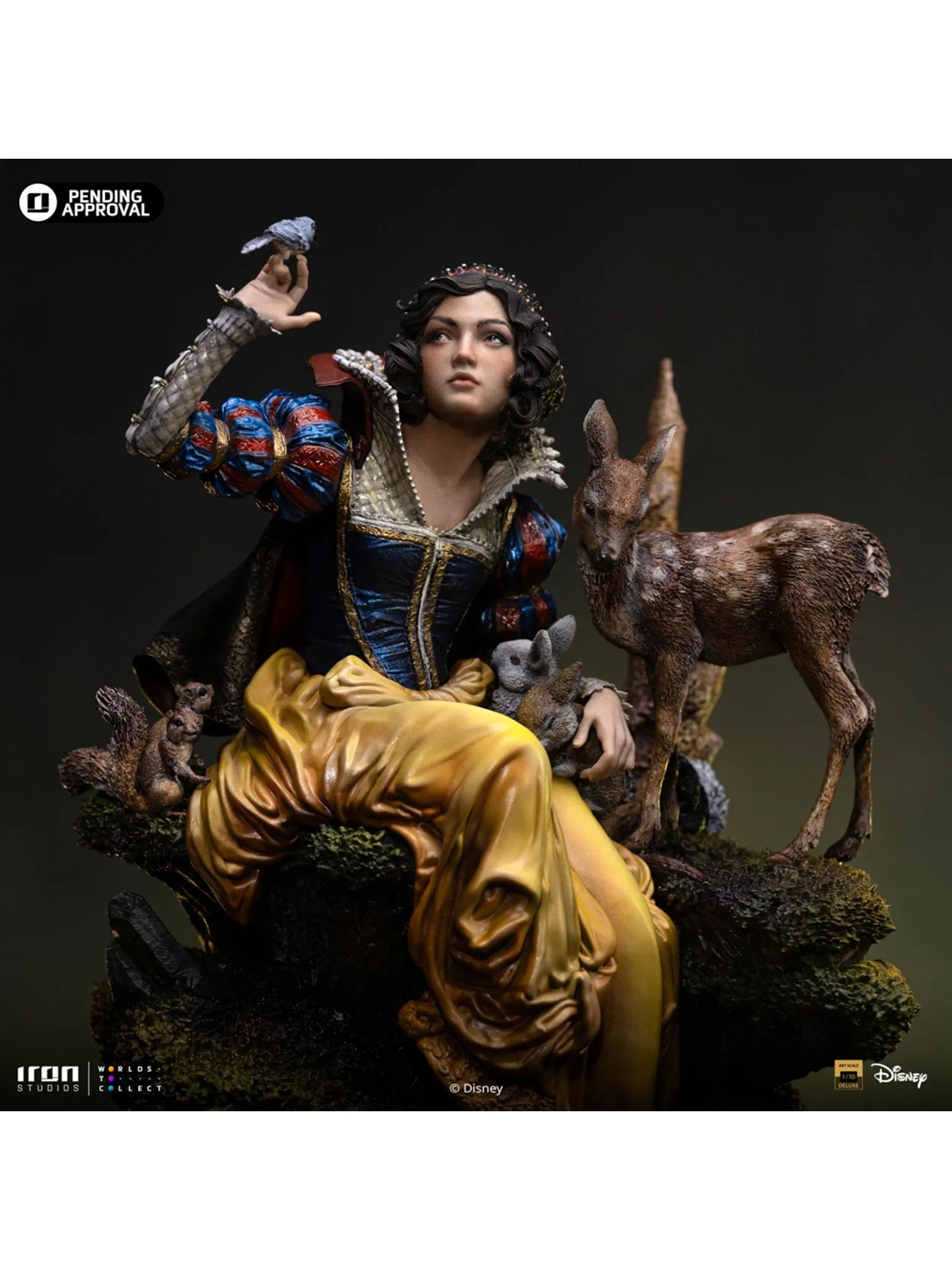 Who is Snow White? Snow White and the Seven Dwarfs is Disney's first animated feature film, released in 1937 and based on The Brothers Grimm fairy tale. Snow White is a princess who lives with her vain stepmother, the Queen. Concerned that Snow White might surpass her beauty, the Queen forces her into servitude as a scullery maid and daily asks her Magic Mirror who is the fairest of them all. For years, the Mirror responds that the Queen is, much to her satisfaction. However, one day, the Mirror declares Snow White to be the fairest. That same day, Snow White meets and falls in love with a prince who hears her singing. The jealous Queen orders her Huntsman to take Snow White into the forest, kill her, and bring back her heart in a jeweled box. However, unable to carry out the act, the Huntsman begs for her forgiveness and reveals the Queen’s intentions. He urges her to flee into the forest and to never return. Lost and frightened, the princess befriends forest creatures who guide her to a quaint cottage deep in the woods. Discovering seven small chairs in the dining room, she assumes the home belongs to seven orphaned children. With the help of the animals, she cleans the house and prepares a meal. The home, however, belongs to seven kind dwarfs who work in a nearby mine and with whom Snow White forms a fun and truthful friendship. Exploring the Snow White statue: Seated gracefully on her long yellow dress on top of a large tree trunk in a lush forest, a young woman with ebony-black hair and snow-white skin, blessed with impeccable and enchanting beauty, wearing a navy blue bodice adorned with gold trim, puffed sleeves in shades of blue, red, and white, and a high white collar with a black cape lined in scarlet on her back, seeks refuge in the forest while surrounded by woodland creatures. Cradling two small hares in her lap, she is accompanied by squirrels, a fawn, and a blue jay perched delicately on the fingers of her right hand, her kindness and purity of spirit bring comfort and trust, allowing the animals to gather around her without fear. Resting on an intricately detailed diorama base featuring references such as the sculpted visage of her wicked stepmother on the rocks below and a beautiful yet deadly golden enchanted apple, the statue is inspired by the masterful painting "With a Smile and a Song" by Heather Edwards. Iron Studios proudly presents the "Snow White by Heather Edwards - Disney - Deluxe Signatures" statue, inaugurating the Deluxe Signatures series, which portrays the finest works of painted art into meticulously detailed three-dimensional sculptures. Figure details: The statue was designed with extreme attention and care, based on the official references, ensuring an impressive display of the figure in any environment. Special features: The statue Snow White by Heather Edwards - Disney - Deluxe Signatures will be produced in limited edition. The diorama base presents rich details inspired by the original references. Materials and finishing of the piece: Just like all the other statues manufactured by Iron Studios, the statue Snow White by Heather Edwards - Disney - Deluxe Signatures will be made with high-quality material such as Polystone, and may contain parts in resin, PVC, metal, and fabric. For the finishing, the hand-painted statue ensures a unique and exclusive artistic touch to satisfy any collector. A product of decades of studying people, environments, animals, and textures, as well as the convergence of each fragment of knowledge attached to them, the paintings of artists Heather Edwards, inspired by the magic from Disney movies, really won over Disney Fine Art and Fantasy Con and got international recognition and awards from prestigious organizations. Her painting process is constantly transforming and evolving, and her paintings are shared and collected worldwide. Snow White is the first Iron Studios statue replicating Heather Edwards’ work, with many other surprises to come! Revealed as part of the "First Seen" presentations at CCXP 24 at Iron Studios' booth, check out the future releases in the Art Scale 1/10, MiniCo, Legacy Replica 1/4, and Demi Art Scale 1/20 lines and much more. Stay tuned on Iron Studios’ social media for updates and get this enchanting statue for your collection now!
