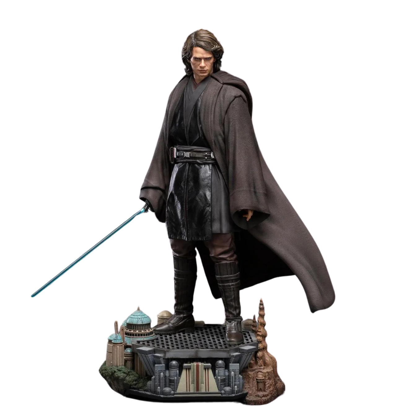 The Jedi Knight considered to be the chosen one to destroy the Sith and bring balance to the Force, dressed in darker attire with a black tunic, is presented on a diorama base which portrays a miniature of the city-planet Coruscant. Coruscant is regarded as the beating heart of the galaxy, home to a diversity of citizens and cultures. It is the seat of the Galactic Republic’s government, the Jedi Temple, and its Archives, where Jedi learning and training took place for over a thousand generations. Wielding his Lightsaber powered by a kyber crystal at the center of the hilt, emitting a high-energy blue plasma blade, the powerful Jedi who became the feared and iconic Sith Lord known as Darth Vader is reproduced with extreme fidelity to the features of actor Hayden Christensen, and with incredible realism in the textures of his attire. Meticulous details are reproduced on the base, and an extra head allows you to display him with or without the hood of his Jedi cloak. Iron Studios proudly presents the "Anakin Skywalker - Star Wars - Legacy Replica 1/4" statue, celebrating 25 years since the start of the trilogy that tells the saga of Anakin, from his childhood in the desert of Tatooine to his rise as a Jedi and fall to the dark side of the Force.