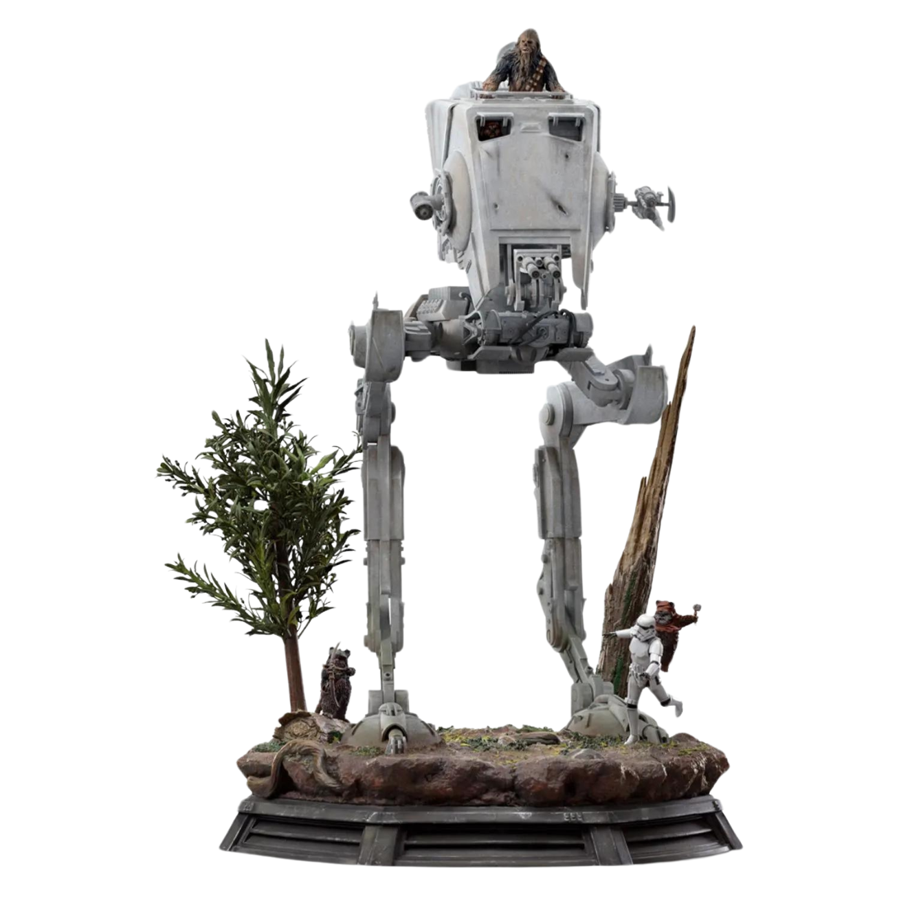 Who are AT-ST and Chewbacca? Chewbacca, affectionately known as Chewie by his friends, is a Wookiee warrior from the planet Kashyyyk, who, alongside his friend and partner Han Solo, worked as a smuggler, mechanic, pilot, and fighter with the Rebel forces and the resistance. Known for his immense strength, bravery, and loyalty, Chewbacca often served as Solo’s conscience. The Ewoks are a primitive tribal species of furry bipeds about one 3 ft. tall, native to the forest moon of Endor. They became famous for helping the Rebel Alliance defeat the Empire's forces in the Battle of Endor, using spears, slings, and knives as weapons, and enabling the destruction of the shield generator, which in turn made the second Death Star battle station vulnerable. With the help of Ewoks named Wunka and Widdle Warrick, Chewbacca manages to seize an All Terrain Scout Transport (AT-ST), a model of Imperial Galactic walker known as the Tempest Scout 2, used by the elite Tempest Force legion, a highly trained group of soldiers guarding the Death Star's shield generator. Using the vehicle to destroy several other AT-STs and assist the small Ewok warriors in defending their home, after most of the imperial forces are wiped out, Chewie joins the Endor strike team. Exploring the AT-ST and Chewbacca statue: On a small moon in the Outer Rim, covered by dense forests, high mountains, and savannas, home to species like the small and furry tribal Ewoks, a Wookiee warrior volunteers for the team tasked with destroying the shield generator of the second Death Star, a moon-sized battle station built by the Galactic Empire as the successor to the first Death Star, and partially completed. On this mission, the charismatic giant furball, with the help of the local natives, manages to take control of a two-legged combat walker, the AT-ST, and use it in his mission against imperial troops guarding the generator. This iconic scene from the movie Star Wars: Episode VI – Return of the Jedi is meticulously recreated by Iron Studios in the statue "AT-ST and Chewbacca - Star Wars - Demi Art Scale 1/20", featuring Chewie emerging from the hatch on top of the AT-ST, alongside the Ewoks battling a Stormtrooper and turning the tide of the battle in favor of the Rebel forces. On a forest diorama base of Endor, the statue also offers the option for the top hatch to be closed. Figure details: Inspired by one of the most memorable scenes from one of the most beloved episodes of the original classic trilogy, with the option to close the top hatch, which ensures an impressive display of the figure in any environment. Special features: The statue AT-ST and Chewbacca - Star Wars - Demi Art Scale 1/20 will be produced in limited edition. The diorama base presents rich details inspired by the original references. Materials and finishing of the piece: Just like all the other statues manufactured by Iron Studios, the statue AT-ST and Chewbacca - Star Wars - Demi Art Scale 1/20 is made with high-quality materials such as Polystone and may contain parts in resin, PVC, metal, and fabric. For the finishing, the hand-painted statue ensures a unique and exclusive artistic touch to satisfy any collector.