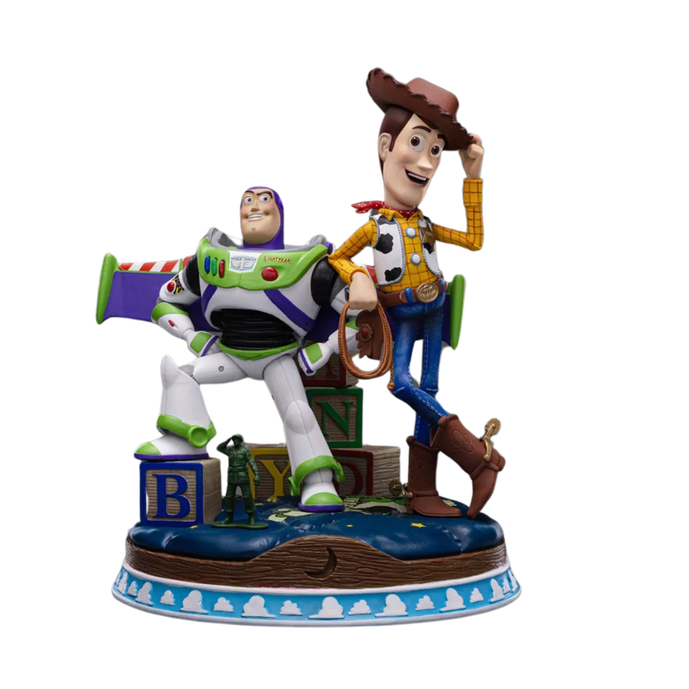 In a world where toys come to life, the figures of a cowboy sheriff, star of a 1950s children's TV series, and a space ranger inspired by a movie, once rivals competing for their owner’s favor, have become best friends after working together to escape various threats and return to the boy who cherishes them. On a base that features the colors, textures, and elements of the bedroom of the affectionate young toy owner who is the heart and soul of this saga, the space hero rests one leg on a wooden cube with alphabet letters from an educational toy, with a small green toy soldier saluting in front of him, while his old west lawman partner, with crossed legs and holding his lasso, leans on his friend's shoulder. Iron Studios proudly presents the statue "Buzz & Woody - Toy Story - Deluxe Art Scale 1/10", featuring the heroes of Pixar's first feature film, released in 1995 and the precursor to a successful franchise that has spawned three sequels, all of which have become major commercial hits acclaimed by critics, as well as spin-off shorts, toys, games, theme park attractions, derivative stories, and collectibles.