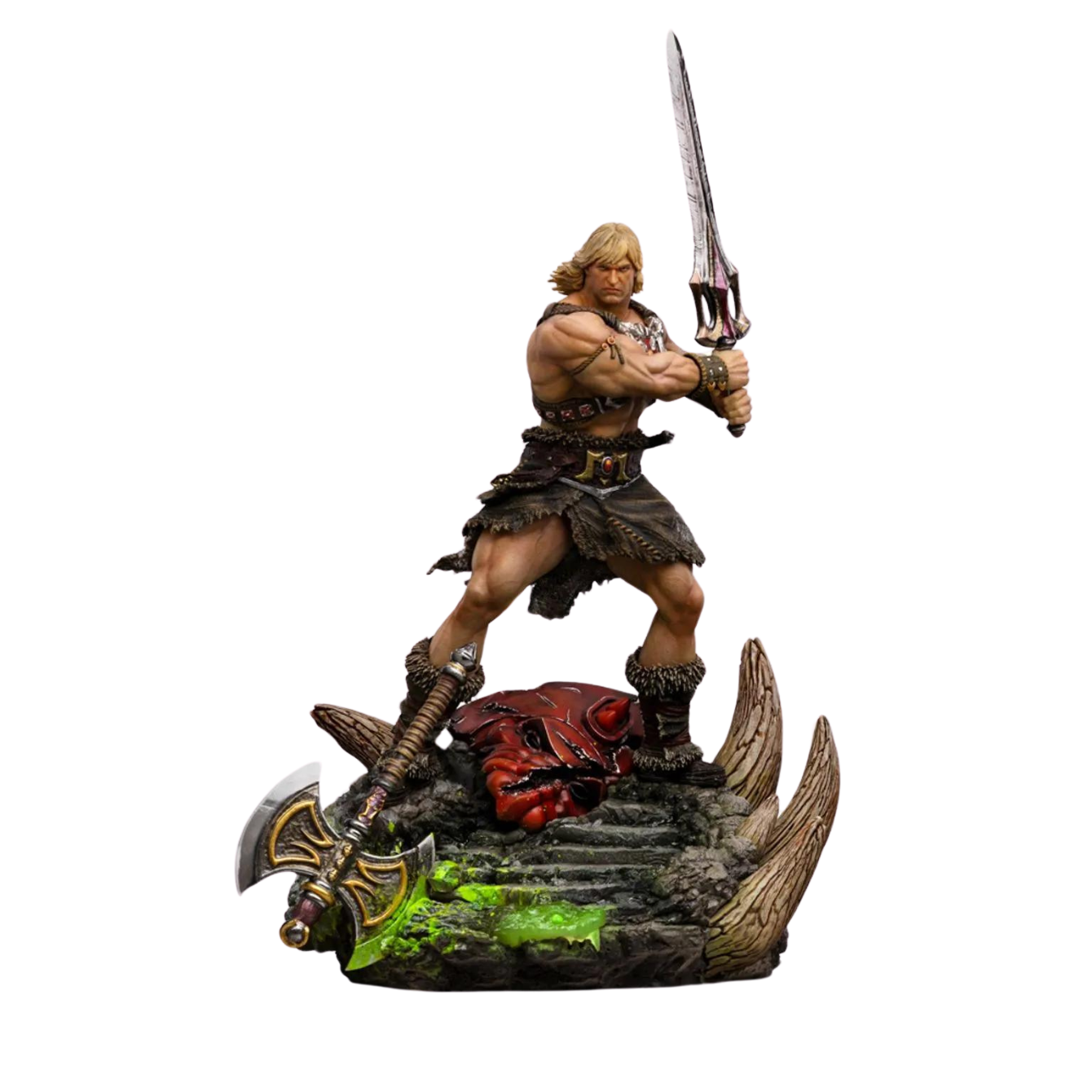 Who is He-Man? The son of King Randor of the planet Eternia and Queen Marlena, a former astronaut from Earth once known as Captain Marlena Glenn, Adam was guided through the Wind Forest of Eternia by a falcon named Zoar to the legendary Castle Grayskull. There, the bird revealed its true human form as Teela Na, the Sorceress. The priestess then informed the young prince that his destiny had been determined since birth, and that he had been chosen to become the guardian and protector of the secrets of Grayskull. Inside the ancient fortress, Adam received the Power Sword, and by invoking the powers of Grayskull with the phrase, he gained incredible powers, transforming into He-Man, an extremely powerful warrior with unlimited super strength, endurance, stamina, speed, agility, enhanced intelligence, and highly skilled combat abilities. Committed to protecting Grayskull and Eternia from evil threats and the universe from malevolent beings, his greatest archenemy is the villain Skeletor, a powerful sorcerer who commands numerous formidable warriors as his minions, seeking to conquer the mystical secrets of Castle Grayskull. He-Man keeps his dual identity a secret, but in addition to the Sorceress, his secret is known by his friends Man-At-Arms, leader of the Royal Guard, Orko, a clumsy extradimensional sorcerer, the enigmatic cosmic enforcer Zodac, and his mother. Exploring the He-Man statue: Wielding his Power Sword, the champion protector of the secrets of Castle Grayskull and defender of the planet Eternia against the evil forces led by his archenemy, the sorcerer known as Skeletor and his minions, prepares for battle on the steps of Grayskull’s gates. At his feet lies the helmet of his best friend and combat partner, the giant feline known as Battle Cat, suggesting that the muscular, golden-haired hero is facing the approaching threat alone. His battle axe is embedded in the rocky steps before him, stained with a green slime derived from the destruction of a mystical energy serpent conjured by his nemesis to attack him. Presented with lifelike looks, featuring a more rugged and barbaric profile, Iron Studios proudly presents its statue "He-Man Unleashed - MOTU - Art Scale 1/10", the second character from Masters of the Universe, following Skeletor, in the Unleashed series, a line of statues with an enhanced standard of excellence in 1/10 scale, set on an extremely detailed base with dark elements evoking a diorama set. Figure details: This new version of the Most Powerful Man in the Universe brings realistic elements to its design, crafter with extreme attention and care, which ensures an impressive display of the figure in any environment. Special features: The statue He-Man Unleashed - MOTU - Art Scale 1/10 will be produced in limited edition. The diorama base presents rich details inspired by the original references. Materials and finishing of the piece: Just like all the other statues manufactured by Iron Studios, the statue He-Man Unleashed - MOTU - Art Scale 1/10 is made with high-quality materials such as Polystone and may contain parts in resin, PVC, metal, and fabric. For the finishing, the hand-painted statue ensures a unique and exclusive artistic touch to satisfy any collector. Revealed on the Inside Iron Studios Day show of September on YouTube, adding yet another Iron Studios statue to the MOTU Art Scale 1/10 collection.