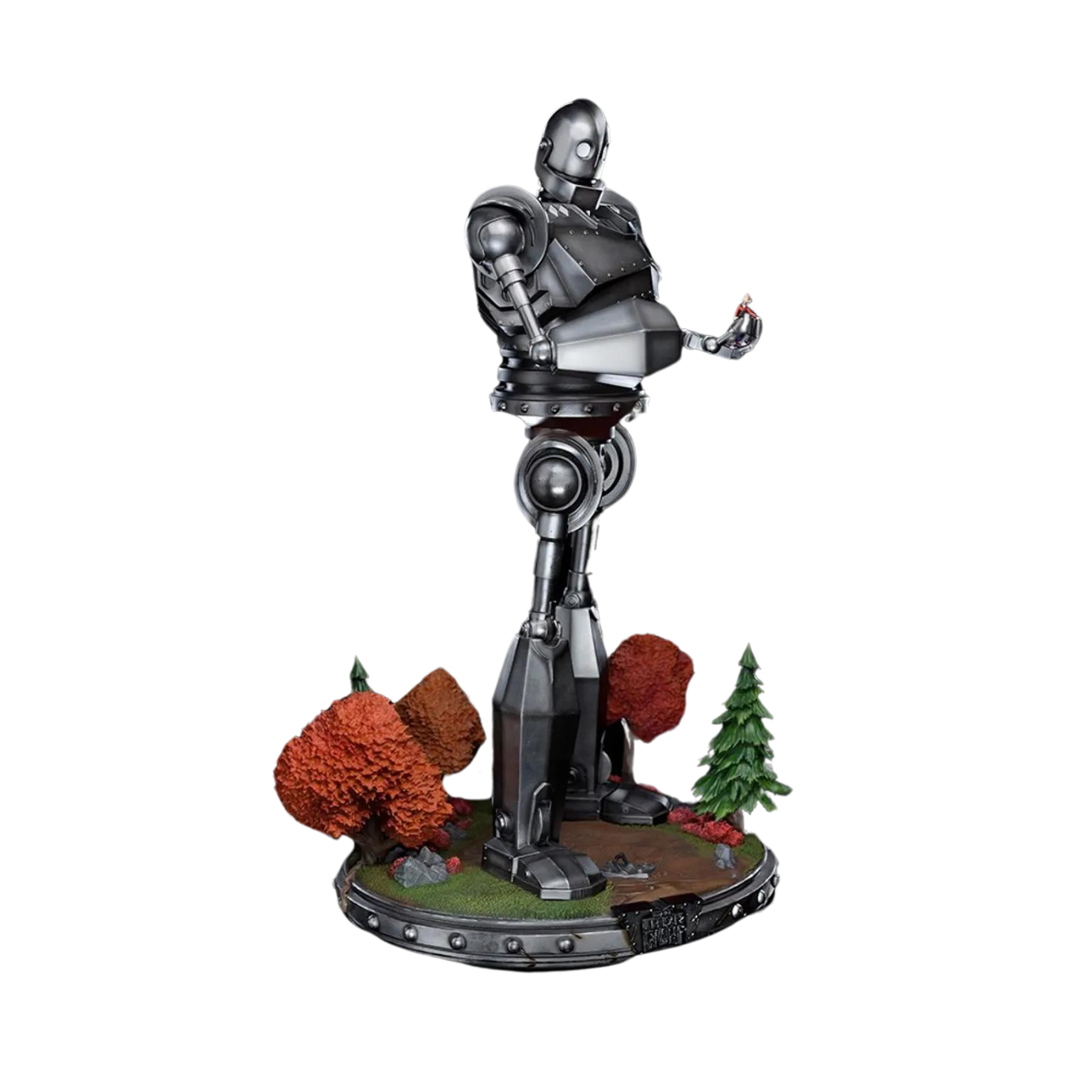 On the plains of a forest in the North American countryside, an armored colossal, docile, and curious autonomous being from another world gently raises a boy in his right hand. Together, they create a strong bond of union, partnership, and learning, in which the boy teaches the mechanical being heroic values and life and death concepts of humanity. On a themed diorama base, bringing the movie logo in the front, surrounded by the crown of large trees with orange leaves of autumn next to sturdy pines, Iron Studios proudly present their statue "Iron Giant & Hogarth Hughes - The Iron Giant - Demi Art Scale 1/20", with the giant robot and his young friend, protagonists of this classic story that became a praised fantasy and science fiction classic.