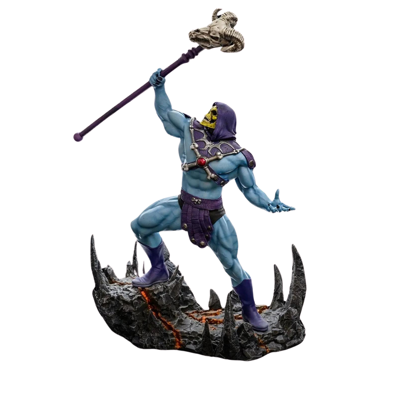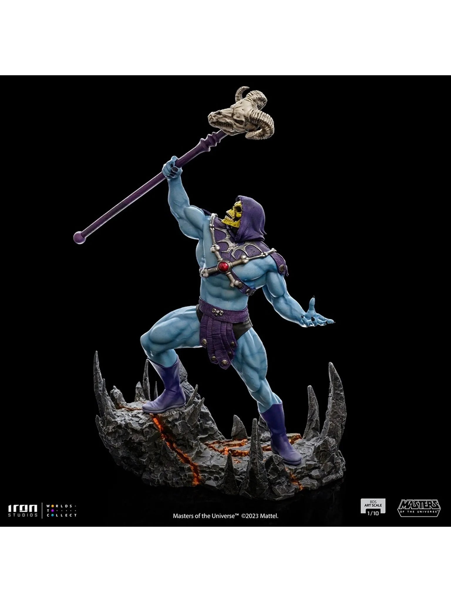 Triumphant in his new territory, the mighty sorcerer raises his Havok Staff, a mystic weapon portrayed as a long scepter crowned with a ram’s skull, used mainly to cast sorceries and channel his magic. Feared both by his enemies and allies alike, the villain with a muscular body, blue skin and skull face imposes his plans of conquest and power in the desolate Dark Hemisphere of planet Eternia, controlling his domains in the Snake Mountain with iron fist. Over a base in which pointy rocks emerge from the ground just like serpent fangs, and crevices on the floor draw an intrinsic and complex vascular system of incandescent lava, Iron Studios proudly present their statue "Skeletor - Masters of the Universe - BDS Art Scale 1/10", with He-Man’s biggest archenemy in a new version for the MOTU collection of statues by Iron Studios, fulfilling the wish of fans and collectors.