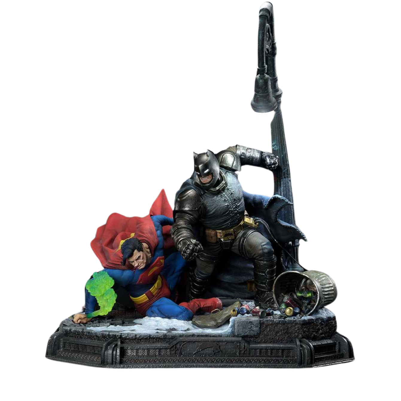 Coming in at a whopping 43 inches tall, our diorama statue freezes time at the exact moment Batman, decked out in state-of-the-art, anti-metahuman armor, lands a jaw-breaking punch on Superman! Situated in Crime Alley, at the site of Bruce Wayne’s parents’ murder by Joe Chill, our diorama includes insane detailing created by our talented studio artists: Superman clutches an arrow emitting Kryptonite gas, shot by a one-armed Green Arrow; Batman, plugged directly into Gotham City’s power grid for his next powerful attack on Superman, the fabric texture of Superman’s iconic costume and the gritty reality of the world they are fighting in.