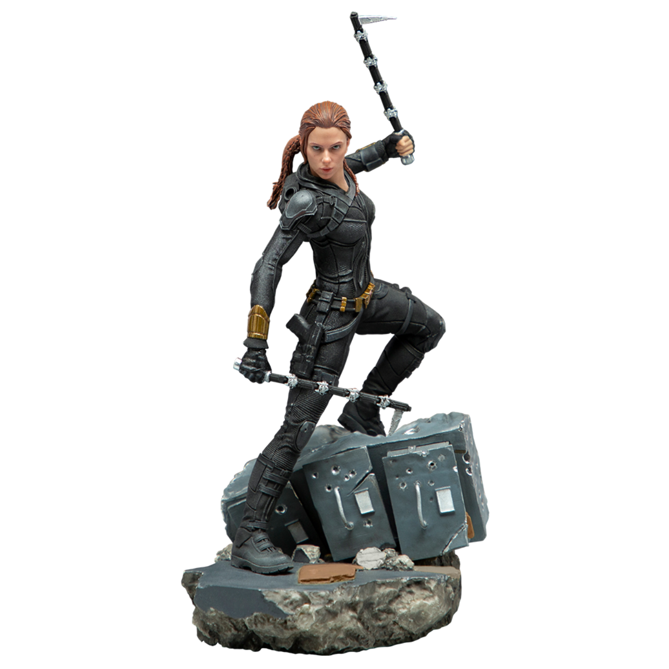 The superheroine is staring intently, moving her sticks and positioning herself for combat, ready to face any opponent. She stands on a base littered with debris from a battle scene, her left leg atop a destroyed old file cabinet. She is wearing her tactical black uniform, with the red buckle of her belt in the shape of the arachnid symbol, which gave rise to her codename. That's how Iron Studios proudly presents its statue of Natasha Romanoff, with the heroine inspired by her long-awaited movie.