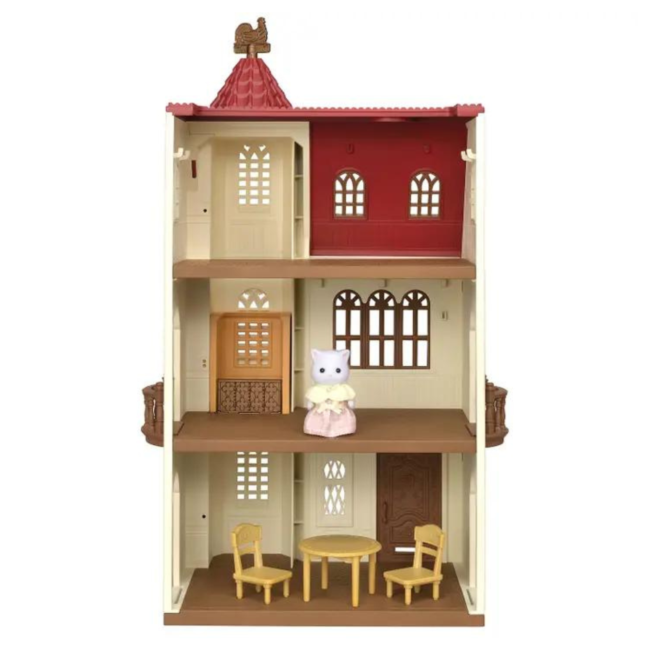 Red Roof Tower Home is a three-story house with a pointed roof and an elevator. It comes with Persian Cat Girl and assorted furniture, so you can play with this set right away. Red Roof Tower Home lets you turn the weather vane to move the elevator up and down. The doors will automatically open and close when it reaches each floor. The Red Roof Tower Home set comes with Persian Cat Girl, a table and chairs. Combine with Red Roof Cozy Cottage, Red Roof Country Home or Sweet Raspberry Home (sold separately) to create a huge house. Or use with other figures and furniture for even more fun (sold separately). Main Unit, Three Floors, Fence x2, Weather Vane, Weather Vane Support Beam, Pointed Roof, Persian Cat Girl, Table, Chair x2 (a total of 11 pieces). Calico Critters are suitable for children ages 3 and above.