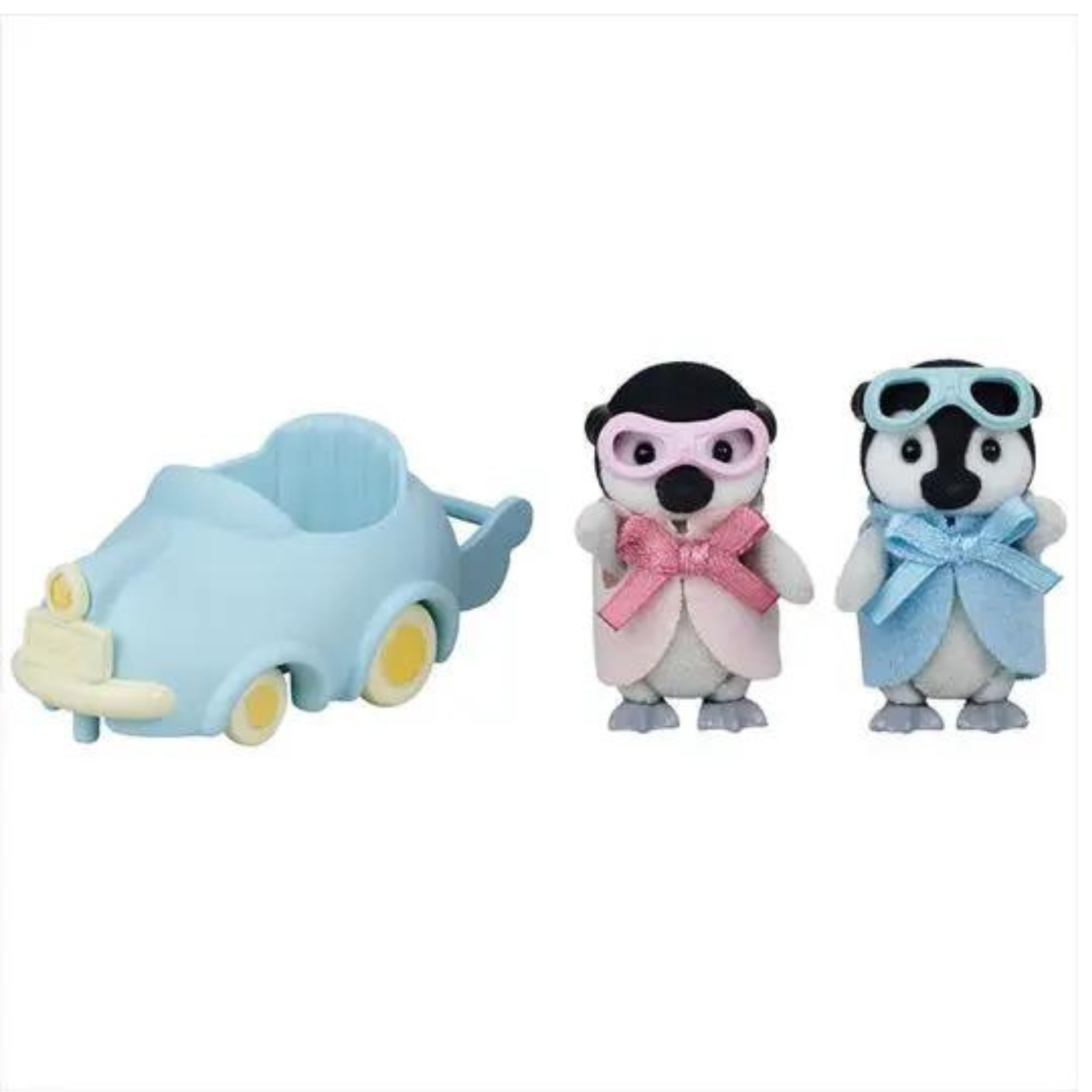 Featuring the Penguin babies Pearl and Rocky, along with a pushcart and aviator goggles. Either of the Penguin babies can ride in the pushcart. The figures' arms, legs and heads can be moved to put them in different poses.