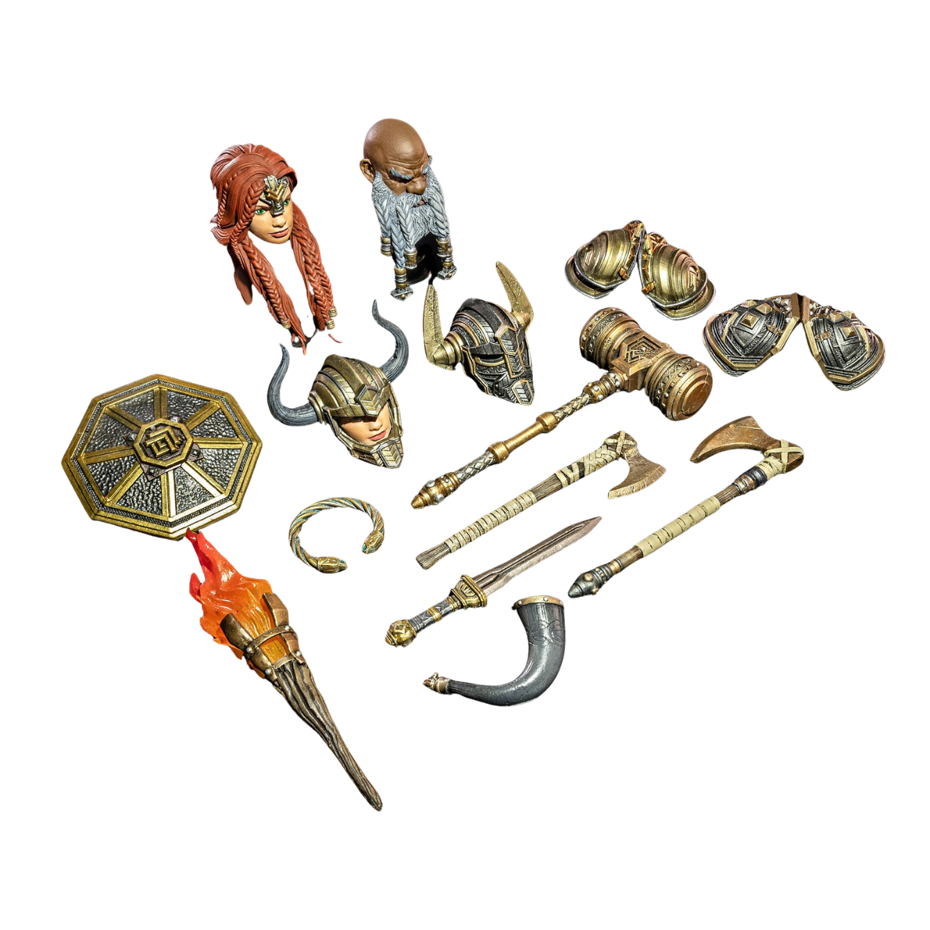 - Accessories: Dwarven sword v2 with scabbard, Viking single-bladed axe, dwarven single-sided axe, dwarven shield v2, drinking horn, torch with red/orange flame, dwarven hammer v2, soft goods cloak, belt trinket