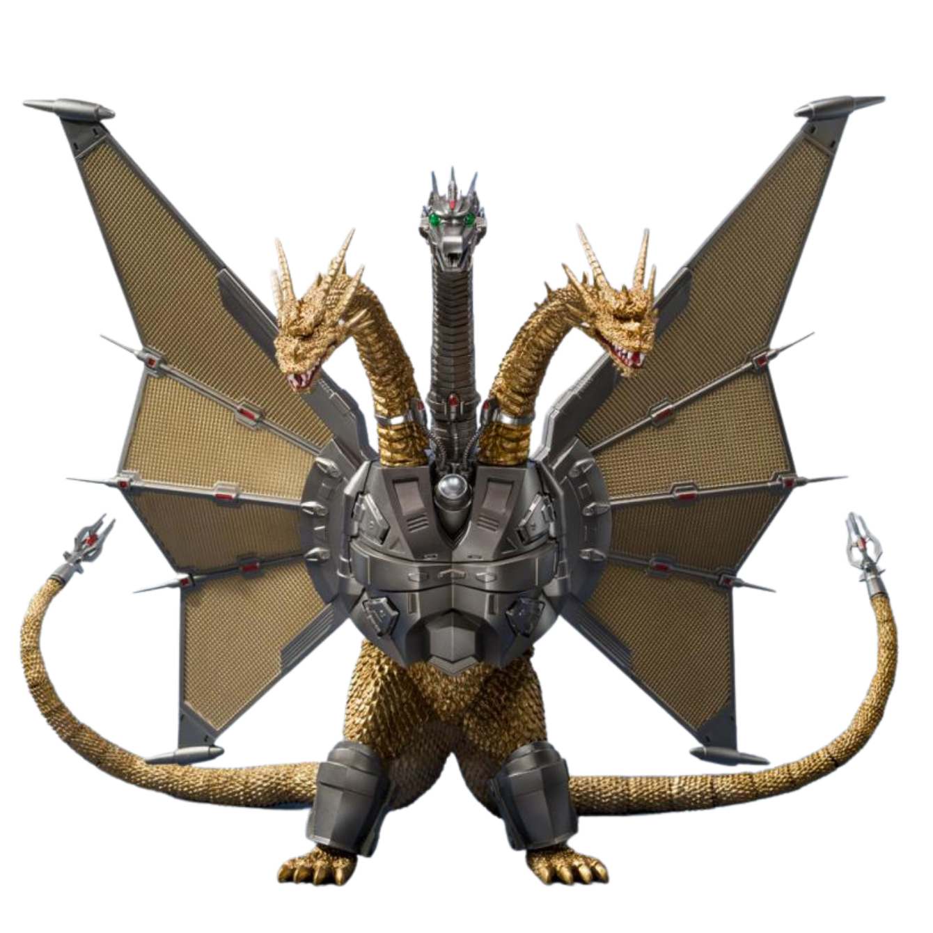 Mecha King Ghidora stands tall at an impressive 9.85 and precisely placed ball joints in the neck and tail allow for unrestricted articulation. The machine hand on Ghidorah’s mechanical torso armor is interchangeable and perfect for posing with your favorite classic S.H.MonsterArts Godzilla (sold separately).