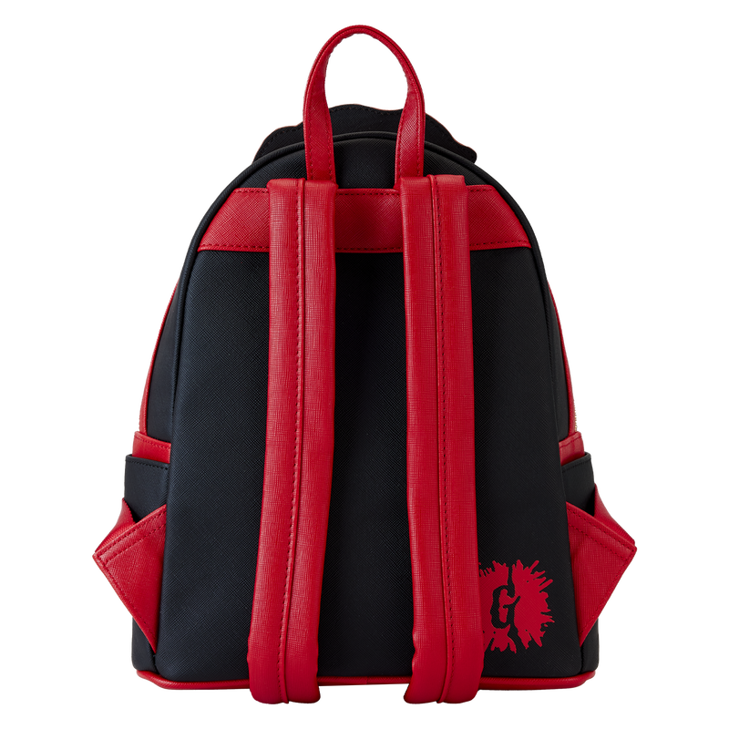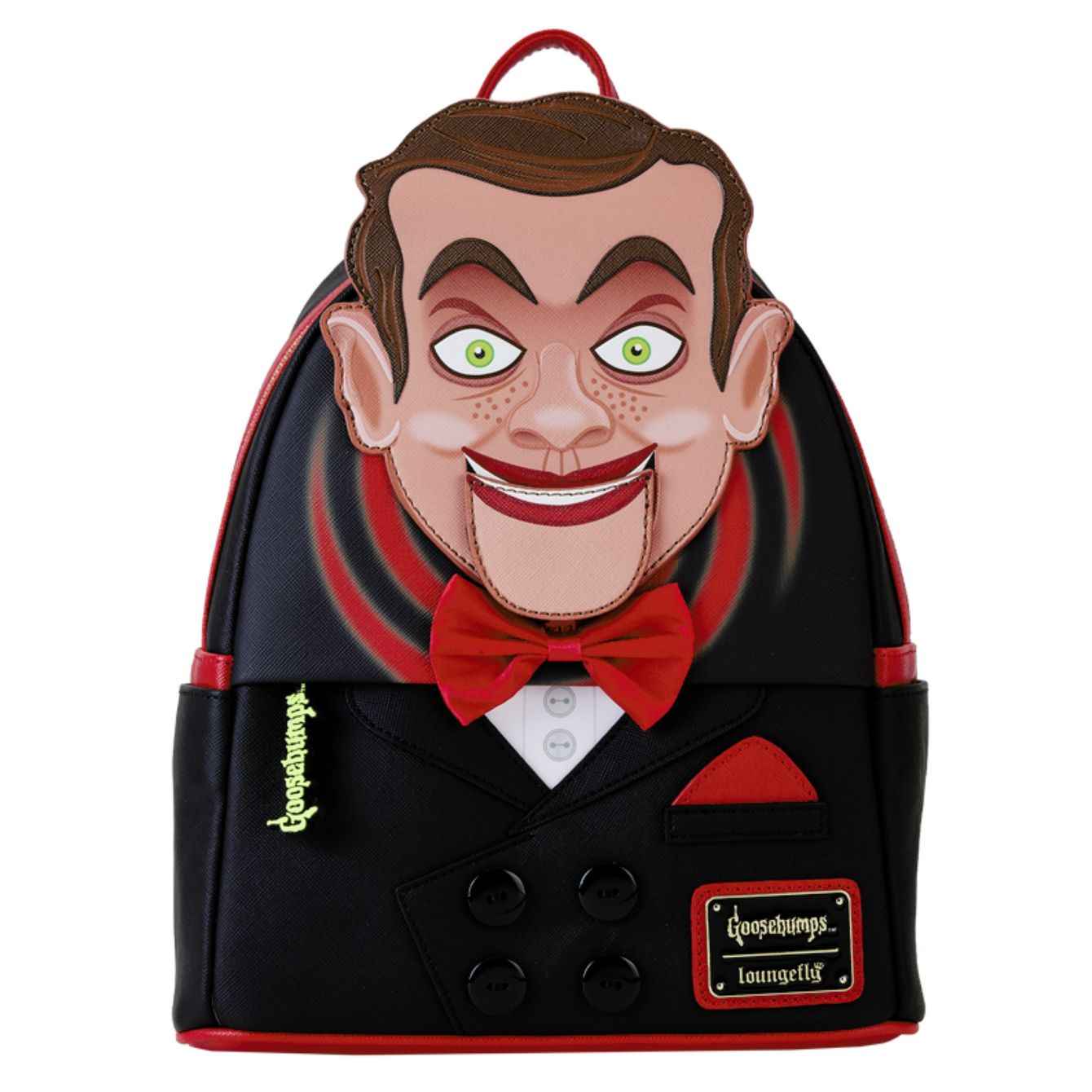 Ready to roam! Pack for adventures with our Loungefly Goosebumps Slappy Cosplay Mini Backpack. Slappy comes to life with all kinds of wickedly fun details. His applique head rises up over the top edge of the backpack, and in the dark, his eyes glow! You can even move his mouth open and closed—to indicate whether Slappy is unhappy or not. The front zipped pocket features real buttons and a satin red bow. The silicone zipper charm that spells out “Goosebumps” in stylized writing completes the look. On the back, you’ll find the Goosebumps logo. Bring a spirit of fun with you wherever you go with this accessory!