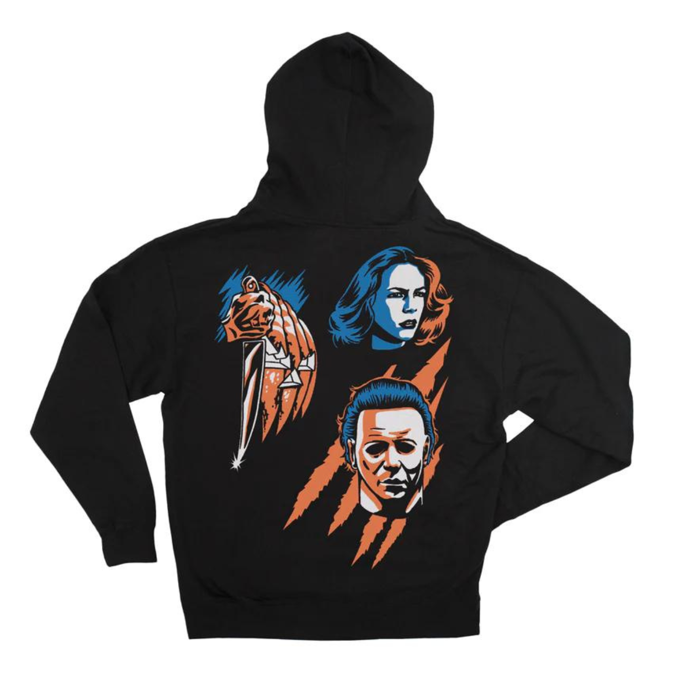 Michael Myers and Laurie Strode face-off - on your hoodie! Halloween® is one of the most revered Horror films ever ~ and October is the perfect time to celebrate this cinematic masterpiece. Complete with the iconic pumpkin butcher knife from the poster on the front and a showdown on the back!
