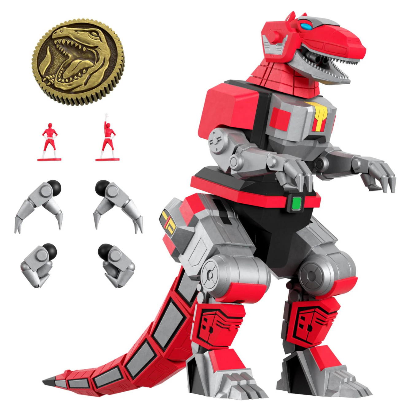 Piloted by the Red Ranger, the Tyrannosaurus Dinozord erupts from the earth to fight the evil forces of Rita Repulsa. This mighty zord is capable of taking on Rita Repulsa’s Evil Space Aliens one-on-one! In combat, it uses its tail to hold its body up and deliver a devastating kick, and one roar can vaporize any opponent. This highly detailed, fully articulated deluxe Tyrannosaurus Dinozord ULTIMATES! figure stands 8” tall (and even longer from head to tail!) and comes with a variety of interchangeable parts and accessories. It’s no tall “tail”- your MMPR collection calls for the Tyrannosaurus Dinozord ULTIMATES! figure!