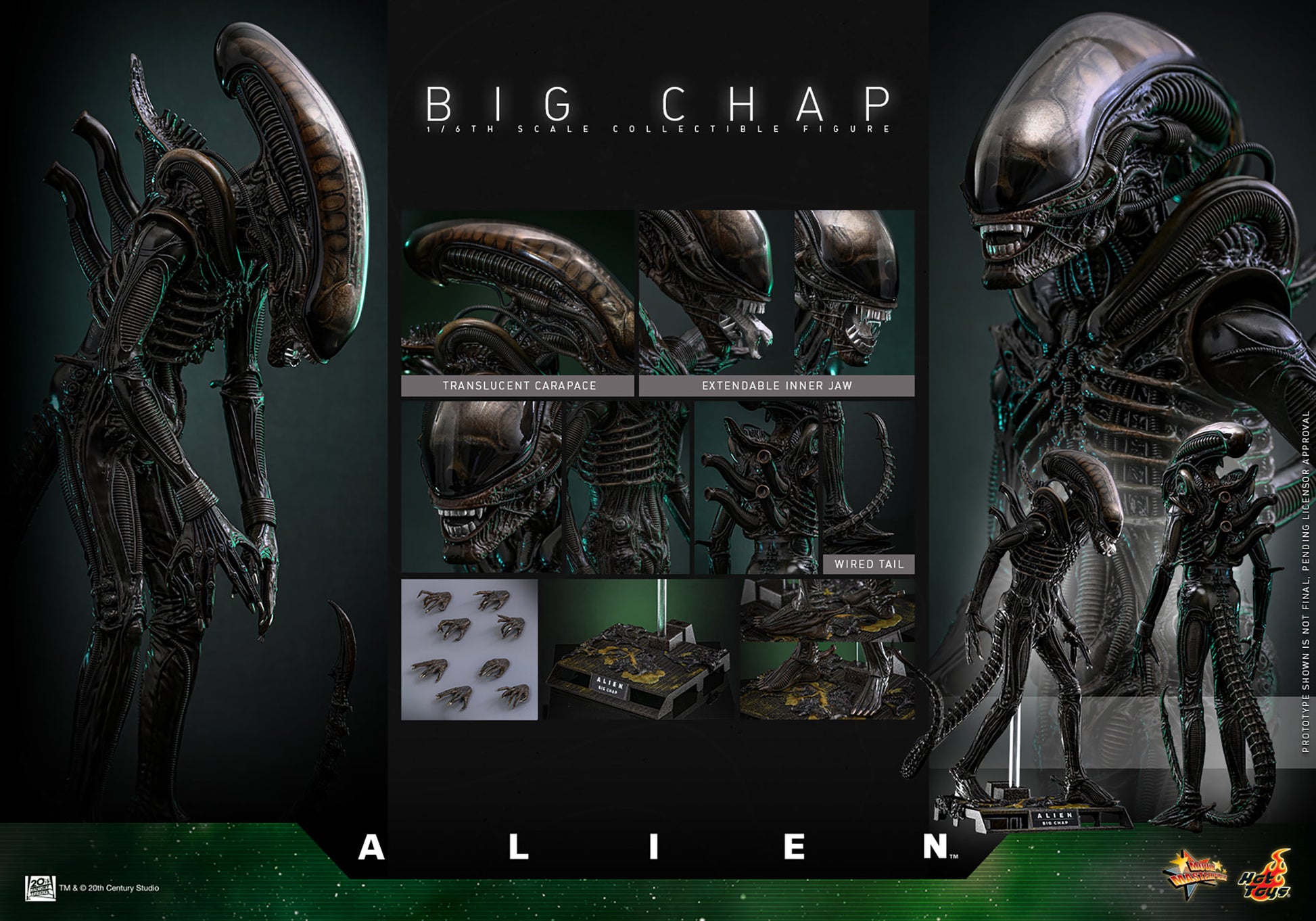 The impressive Big Chap sixth-scale collectible figure stands at approximately 36 cm tall and is expertly painted and sculpted to capture the organic appearance of a Xenomorph. It features a newly developed head sculpt with intricately crafted internal structures visible beneath a translucent carapace, along with an articulated jaw. The newly designed extendable inner jaw allows collectors to create dynamic facial expressions. The body is meticulously painted and sculpted to showcase its fine textures, complete with a bendable tail and eight interchangeable hands, including one pair with bendable fingers, enabling collectors to create dynamic poses. Additionally, it comes with a Xenomorph remains-themed diorama base for an immersive display.