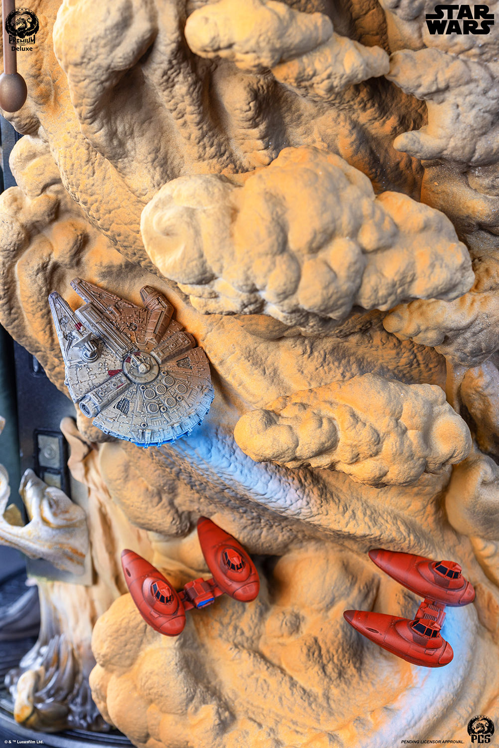 The bust also includes a recreation of Cloud City, the floating metropolis that serves as the setting for so many beloved story moments, wreathed in orange clouds that transition to an ethereal vision of the Mandalorian crest seeming to form in the atmosphere.