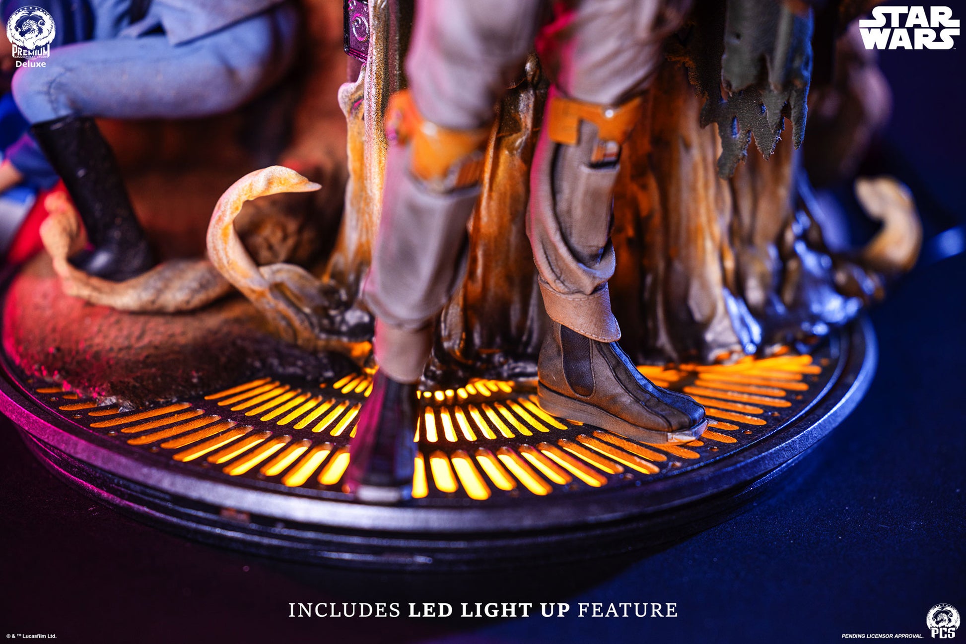 The Boba Fett - Fine Art Bust features LED light up features to add an extra sense of excitement and drama to this already staggering piece. The warm glow emanating from beneath the floors of the carbonite freezing chamber illuminates a highlight of this piece, a statue of the disquietingly stoic Boba Fett standing beside his frozen quarry.