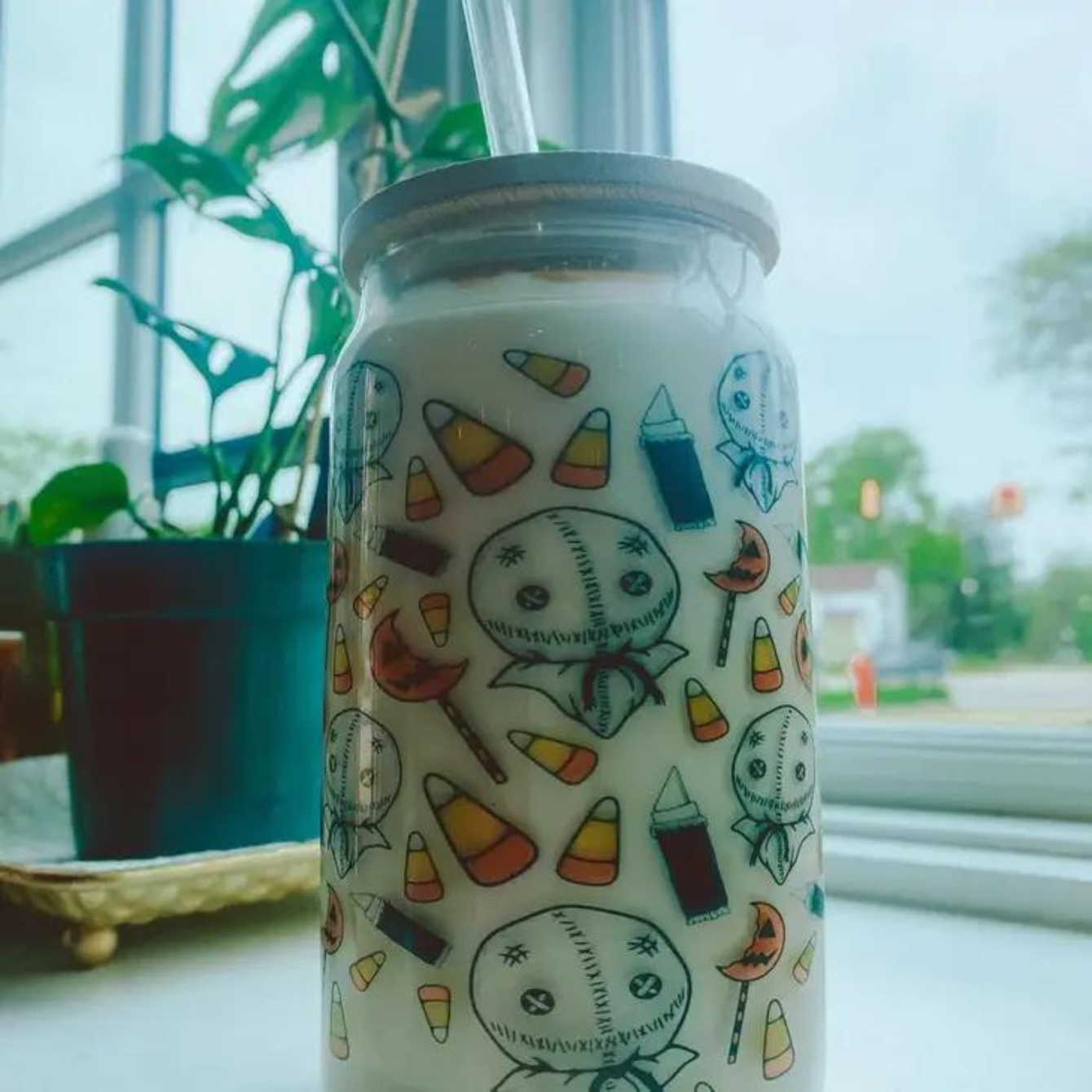 Our sam trick r treat glass tumbler is 16 oz with a plastic straw + bamboo lid! These are sublimated (no vinyl, no peeling) These are sublimated right in our warehouse compatible with hot and cold liquid We recommend hand washing but at your own risk you can use the top rack of your dishwasher on delicate - glass cycle Image is black, orange and yellow The cup is see through! The white is liquid Design by @radmadprints